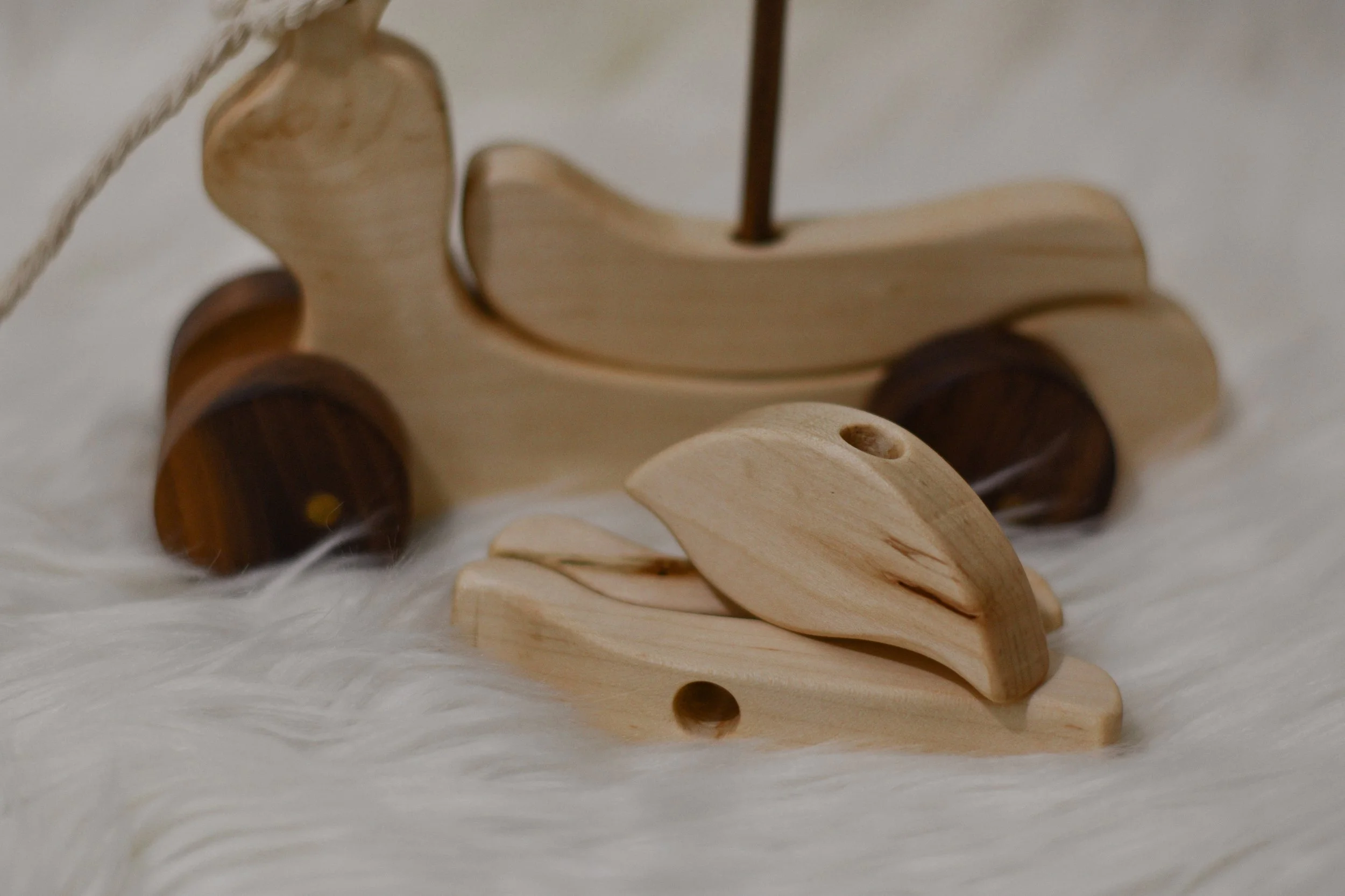 Our toys are crafted with great attention to detail and are sanded to a silky texture. In addition, they are treated with our organic board butter to ensure their longevity. Our ducks are available in maple or walnut wood with pine, or walnut wheels. Each item can be personalized with a Hand-Engraved name to make them extra special.